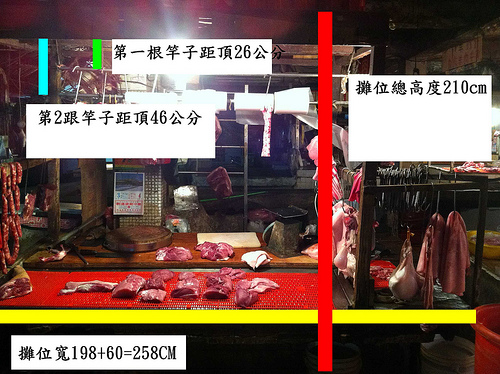 因為設計師希望可以知道真實的攤位比例,愈是我又利用晚上的時候去量了攤位的比例,並直接標註在照片上,讓設計師可以了解比例大小